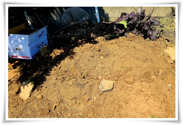 마지막 비닐 위에 흙덮기 작업으로 중부지방은 40~50cm, 남부지방은 30~40cm의 두께로 흙을 복토하고 빗물이 고이지 않고 배수가 잘 되도록 도랑을 만들어 줍니다.