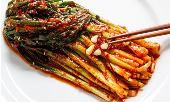 쪽파를 주재료로 한 김치는 매콤하고 아삭한 맛이 일품입니다.