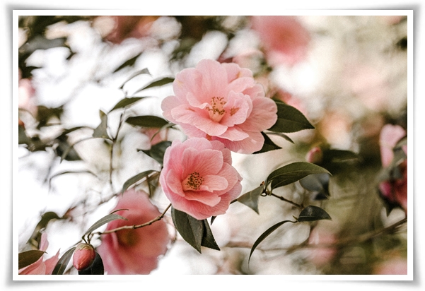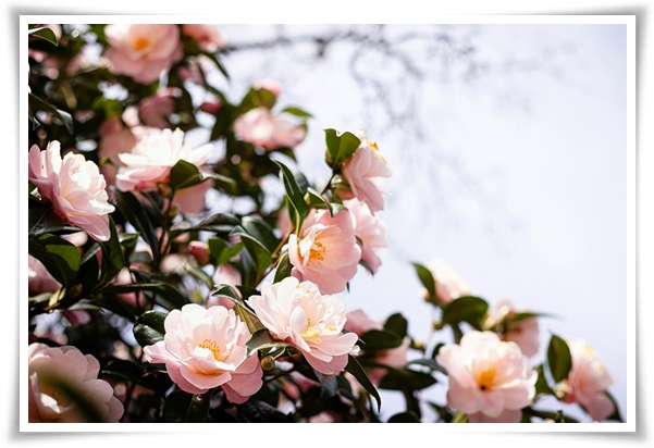 동백꽃은 흰색, 분홍색, 빨간색 등 다양한 색상으로 피어나며, 일부 품종은 노란색이나 라벤더 색을 띠기도 합니다.