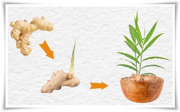 싹이 트기 시작한 생강 조각을 골라, 싹이 위를 향하도록 놓습니다. 화분이나 텃밭에 심을 때는 각 생강 조각 사이에 약 10~15cm 정도의 간격을 유지해 주어야 서로 영양분을 침범하지 않고 건강하게 자랄 수 있습니다.
