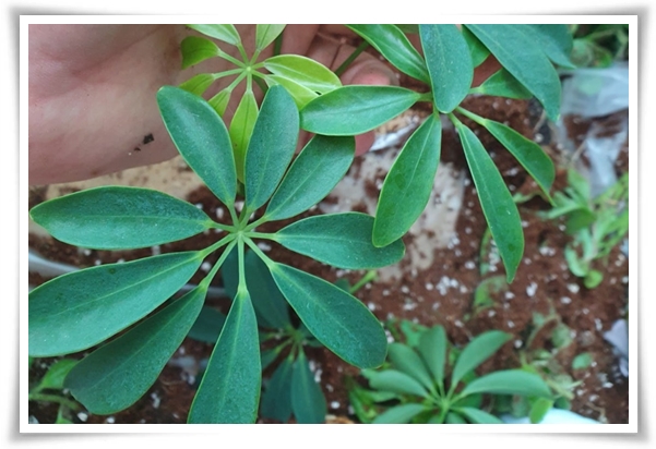 잎은 깊은 녹색으로, 각 잎은 길이가 3~6cm에 달하며, 일반적으로 5~10개의 잎이 모여서 한 송이를 이룹니다.