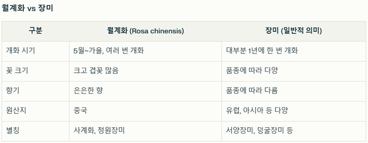 가장 큰 차이점은 개화 기간입니다. 대부분의 장미는 봄이나 초여름에 집중적으로 피고 지지만, 월계화는 이름처럼 '달마다' 혹은 '사계절' 꽃을 피우는 능력이 뛰어납니다.