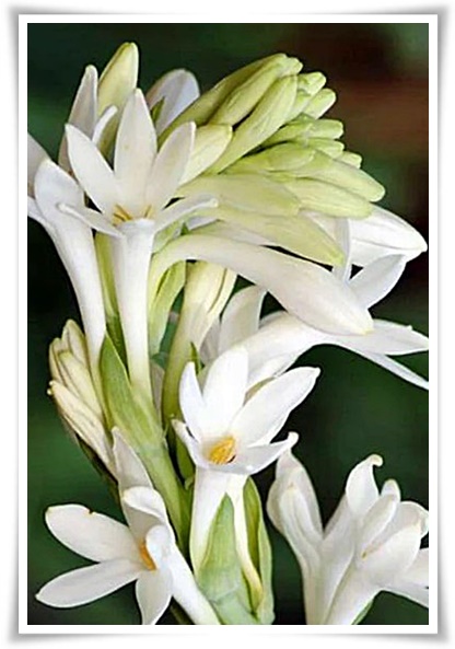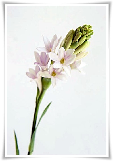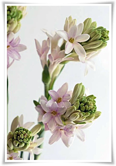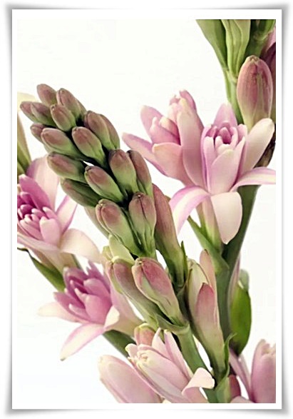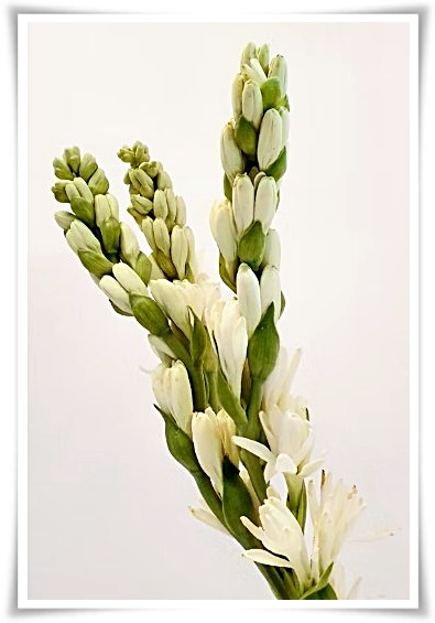 튜베로즈는 길고 곧게 뻗은 줄기에 하얀색 또는 분홍색의 별 모양 꽃들이 다발로 피는 것이 특징이에요.