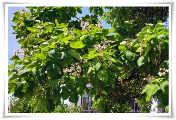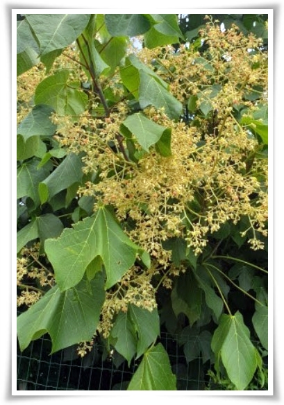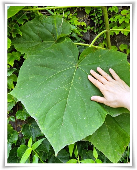 이 커다란 잎은 더 많은 햇빛을 받아들여 빠르게 성장하는 데 도움을 주며, 또한 효과적인 그늘을 제공하고, 살충 효과가 뛰어나 옛날에는 재래식 화장실에 넣어두기도 했습니다.